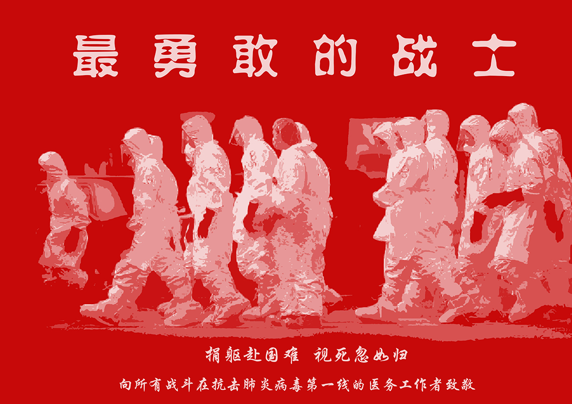 設(shè)計說明:畫面表現(xiàn)了一群正要上前線的醫(yī)務(wù)人員形象,國難當前他們能戰(zhàn)勝病魔還大家一片安寧,是最勇敢的戰(zhàn)士。捐軀赴國難,體現(xiàn)了醫(yī)務(wù)工作者視死如歸的精神!