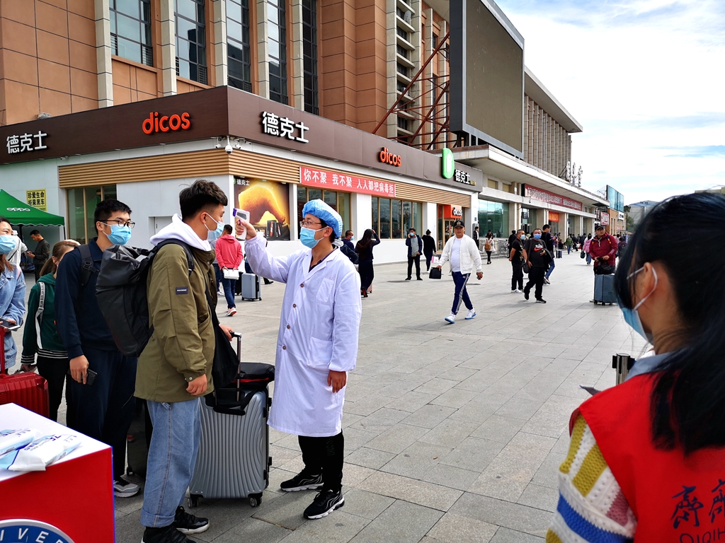 暴風雨過后的齊齊哈爾較往年同期溫度要低很多,機電工程學院輔導員張國梁早上6:30就跟隨校車去火車站迎接返校同學,他需要負責指導學生掃碼、測溫,幫助學生拿行李上車,安排學生有序乘坐校車返校。他說:“天氣雖冷,但是看見學生回來的那一刻心里是火熱的,我會盡最大努力幫助學生,讓同學們感受到回家的溫暖?!?/p>