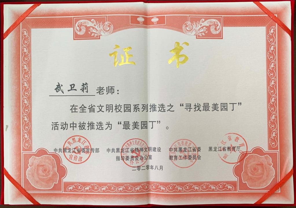 由于出色的班主任工作,2015年武衛(wèi)莉老師榮獲?!叭恕毕冗M工作者標兵;2016年被評為齊齊哈爾大學(xué)“班主任年度人物”。