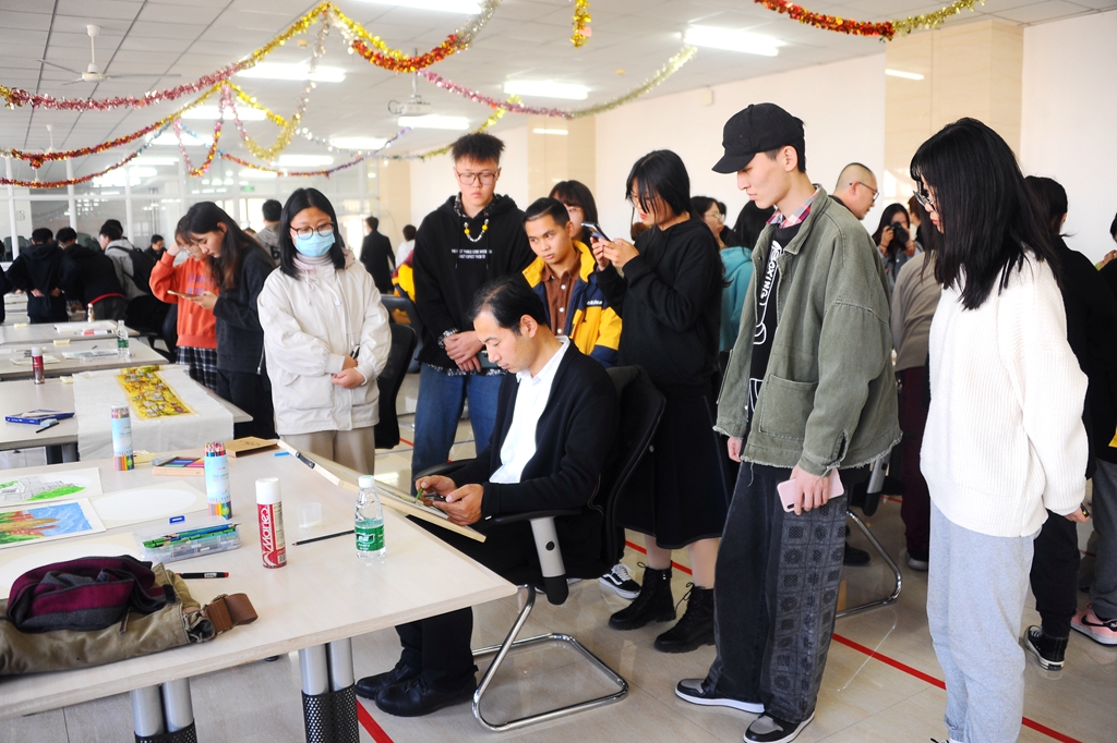 活動中,來自繪畫系的15名教師進行了現(xiàn)場作畫,現(xiàn)場師生觀眾們根據(jù)自己的興趣愛好流動性地進行了觀看學(xué)習(xí)或者現(xiàn)場臨摹,并與創(chuàng)作老師互動交流。