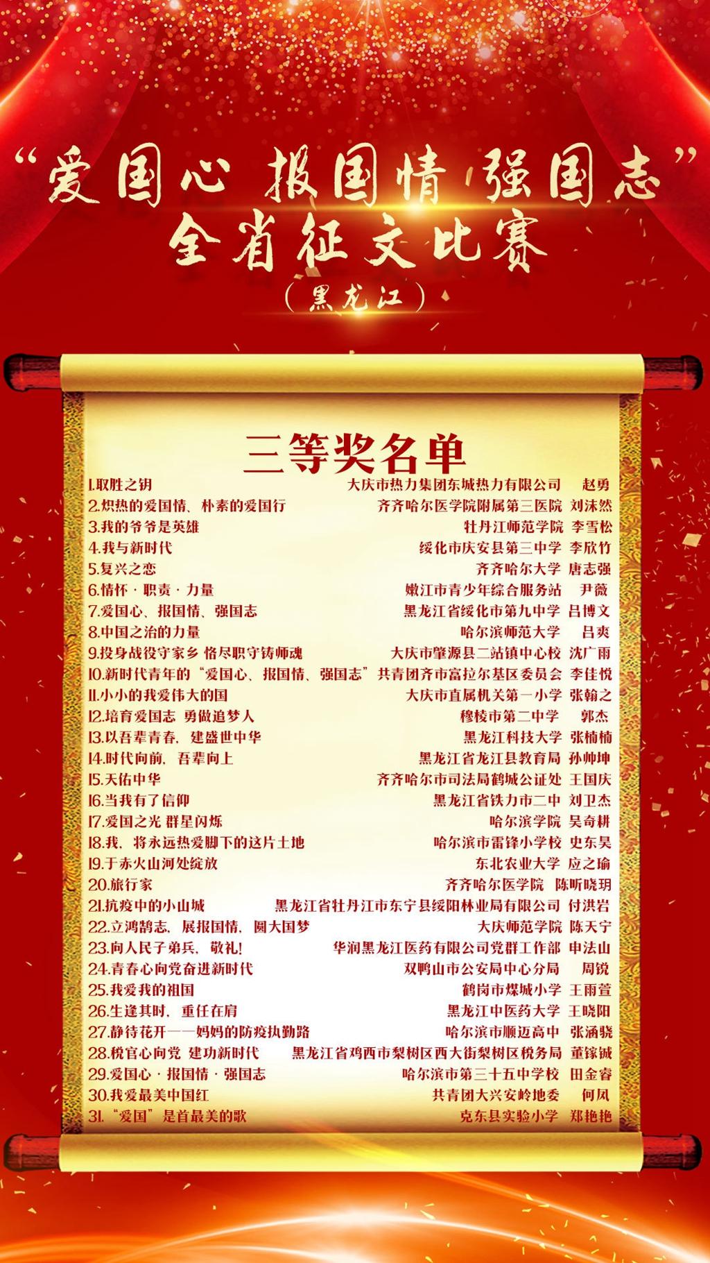 為深入貫徹落實(shí)習(xí)近平新時(shí)代中國(guó)特色社會(huì)主義思想,深化愛國(guó)主義教育,促進(jìn)青少年健康成長(zhǎng),培養(yǎng)擔(dān)當(dāng)民族復(fù)興大任的時(shí)代新人,“學(xué)習(xí)強(qiáng)國(guó)”學(xué)習(xí)平臺(tái)開展了以“愛國(guó)心·報(bào)國(guó)情·強(qiáng)國(guó)志”為主題的征文活動(dòng)。11月12日,“學(xué)習(xí)強(qiáng)國(guó)”黑龍江學(xué)習(xí)平臺(tái)發(fā)布了征文活動(dòng)獲獎(jiǎng)名單,我校遴選推薦的兩篇原創(chuàng)作品在全省征文活動(dòng)中分獲一等獎(jiǎng)和三等獎(jiǎng),在全省高校名列前茅。