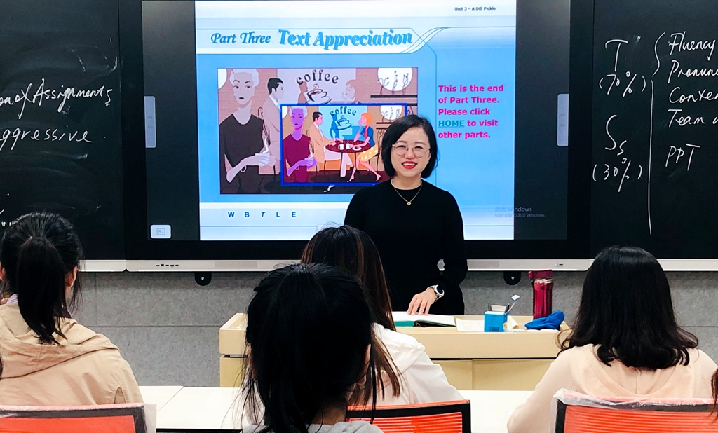 新冠肺炎疫情爆發(fā)后,全校上下積極響應(yīng)國家號召“停課不停學(xué)”,在線教學(xué)工作扎實開展。王楠同教學(xué)團(tuán)隊一道,在短短十天的時間里完成兩門在線課程的建設(shè),保障了疫情期間在線教學(xué)的順利開展。在線教學(xué)期間,她投入了大量的時間和精力,每周平均批閱文本類作業(yè)120份,語音作業(yè)300多分鐘,課堂互動程度與線下傳統(tǒng)課堂最大程度持平,利用信息技術(shù)為學(xué)生們提供更多的課堂互動、鼓勵更多的同學(xué)參與教學(xué)活動,最大化發(fā)揮了師生共同評價機(jī)制,讓學(xué)生們參與到教學(xué)中,以評促學(xué),在評價中學(xué)習(xí),以評價標(biāo)準(zhǔn)為參考提升其英語專業(yè)素養(yǎng)。在學(xué)期末,王楠充分利用新媒體技術(shù)優(yōu)勢,及時有效地為學(xué)生課前自主學(xué)習(xí)提供充足的預(yù)習(xí)資源,為他們提供課后作業(yè)的反饋。一個學(xué)期下來,她所教授的幾個班級學(xué)生的口語表達(dá)技能均有明顯地提升,同時學(xué)生們在語篇理解、文本分析等方面都有了長足進(jìn)步。這一教學(xué)模式和教學(xué)經(jīng)驗,疫情期間在全國范圍內(nèi)得到了廣泛推廣。