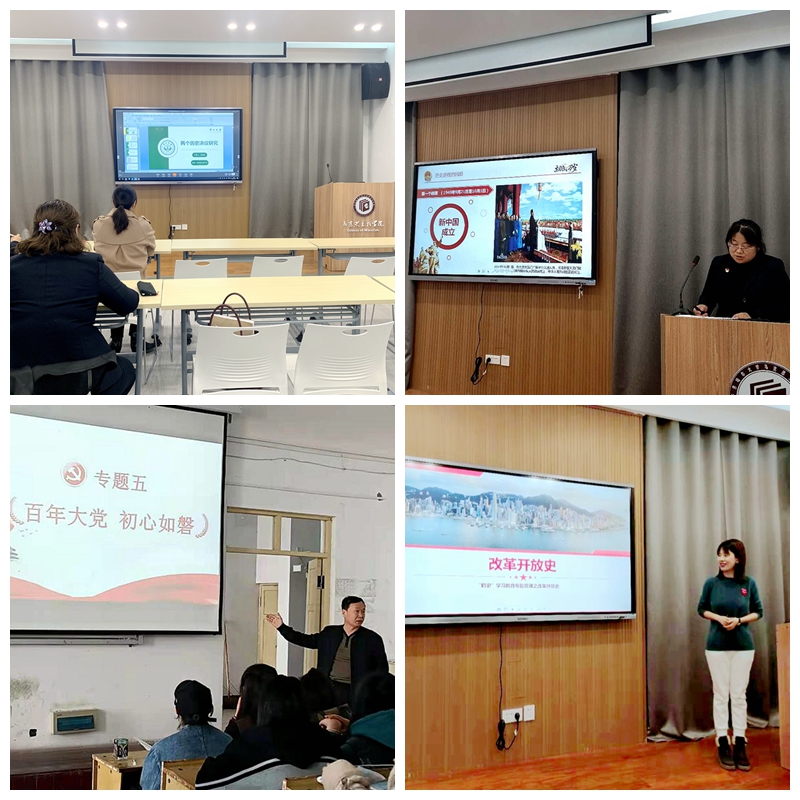 2020年以來,馬克思主義學(xué)院結(jié)合“三會(huì)一課”,開展了系列“四史”集中學(xué)習(xí)。以支委會(huì)設(shè)定議題討論學(xué),黨員大會(huì)集中學(xué),黨小組研討學(xué),先后就黨的成立、兩個(gè)歷史決議、新中國史、改革開放史進(jìn)行專題培訓(xùn)學(xué)習(xí)。通過講黨史故事追憶崢嶸歲月,敘新中國史歌頌偉大成就,談改革開放史禮贊非凡業(yè)績(jī),研社會(huì)主義發(fā)展史理清時(shí)空脈絡(luò)。以教師先學(xué)先會(huì)先行引導(dǎo)學(xué)生學(xué)會(huì)學(xué)懂學(xué)深。本學(xué)期,還在形勢(shì)與政策課中設(shè)置了“百年大黨 初心如磐”的專題,使黨史學(xué)習(xí)教育在課程上做到專題化、理論化、系統(tǒng)化、長(zhǎng)期化。