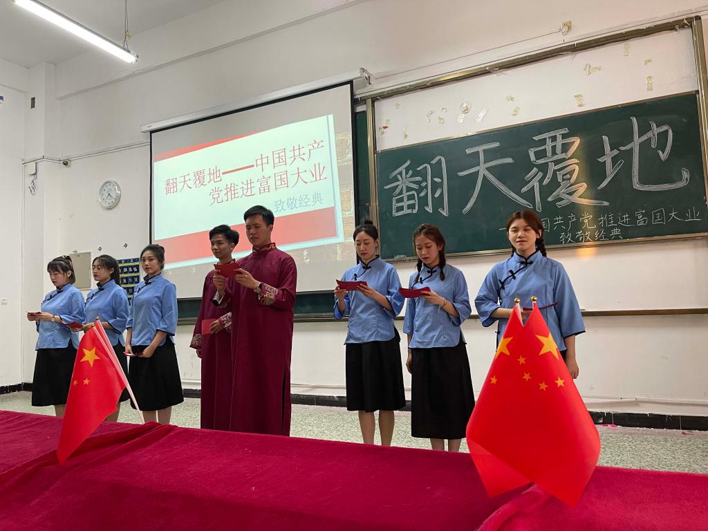 百年征程波瀾壯闊,百年初心歷久彌堅(jiān)。學(xué)生通過一封家書誦讀、影視劇配音、情景劇表演和經(jīng)典朗誦,生動(dòng)再現(xiàn)了中國共產(chǎn)黨波瀾壯闊的百年奮斗歷程與光輝足跡,生動(dòng)地反映黨的不懈奮斗史、不怕犧牲史、理論探索史、為民造福史、自身建設(shè)史。