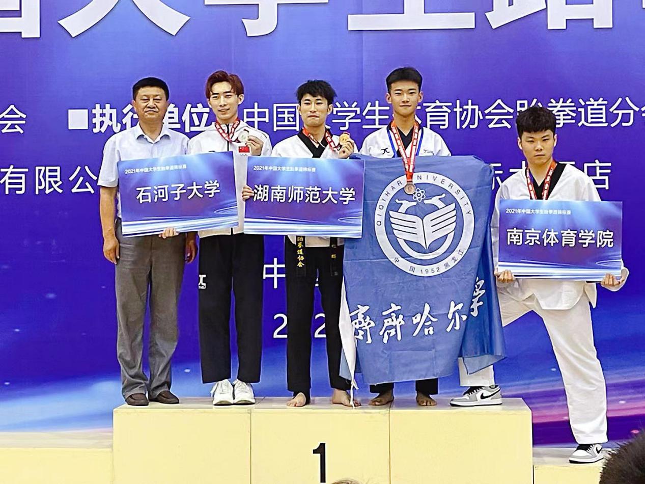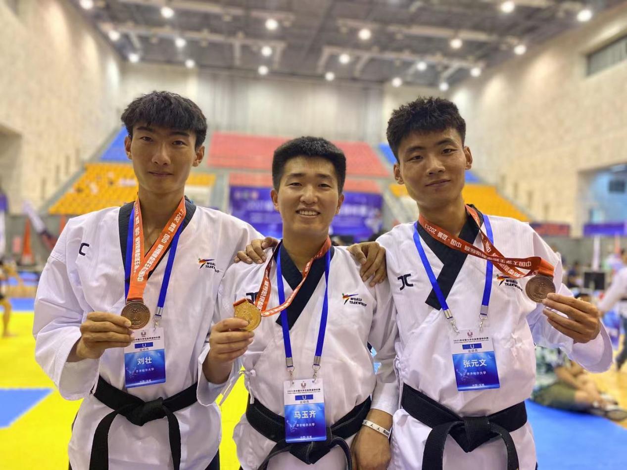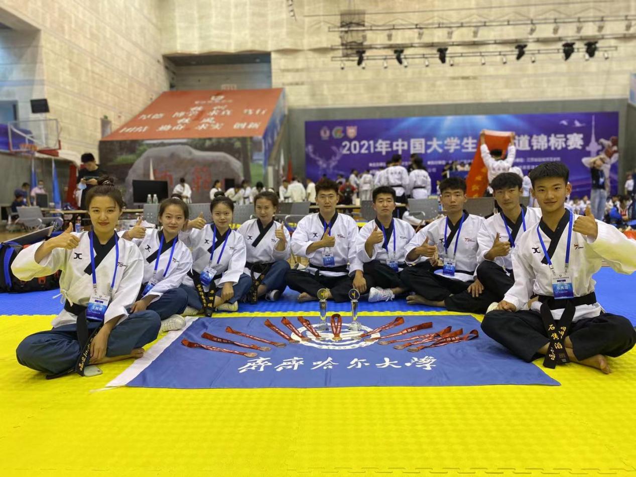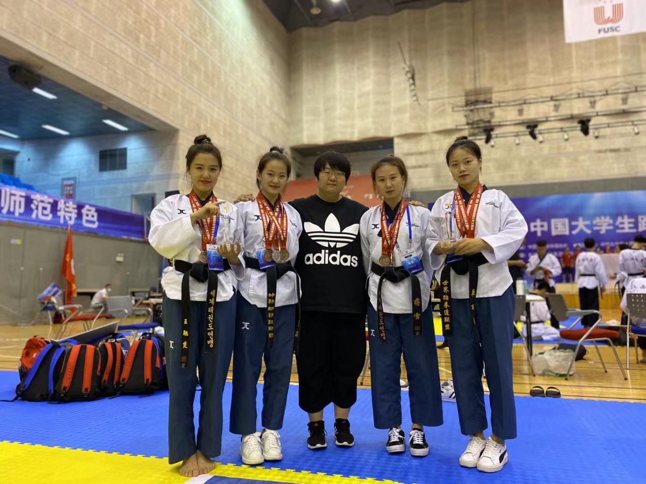 學(xué)校對此次大賽高度重視,由體育學(xué)院修月老師帶領(lǐng)9名學(xué)生參加此次國家級別賽事。經(jīng)過五天激烈的賽場角逐,取得了1金、2銀、6銅的好成績。我校學(xué)生李揚獲得男子個人品勢金牌;楊子琪、馬玉齊兩名同學(xué)榮獲銀牌;王翹楚、蔣雪、單麗媛三名同學(xué)榮獲女子團體品勢銅牌;張元文、劉壯、石雋滔三名同學(xué)榮獲男子個人、團體銅牌;跆拳道舞獲得團體項目銅牌。并取得了高水平組團體總分第四的歷史性突破成績。