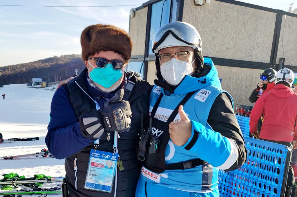 (國際雪聯(lián)技術(shù)官喬(左)我校教師郭晗(右))
