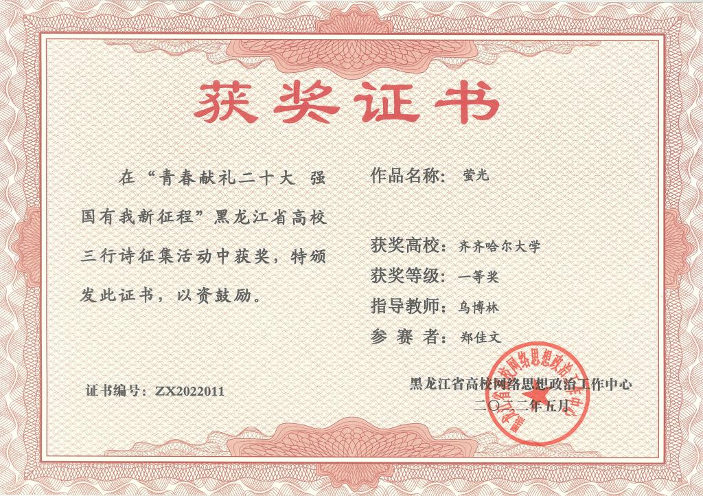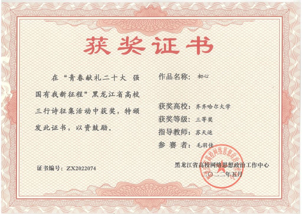 發(fā)布日期:2022-05-19 點擊量:日前,黑龍江省高校網(wǎng)絡(luò)思想政治工作中心下發(fā)了《關(guān)于開展“青春獻禮二十大 強國有我新征程”全省高校三行詩征集活動的通知》,校黨委宣傳部按照通知要求廣泛宣傳,積極組織學(xué)生以三行詩的形式表達愛國之情和青春之志,共征集優(yōu)秀三行詩作品200余首,經(jīng)過學(xué)校評審,擇優(yōu)上報了10首優(yōu)秀三行詩作品。
