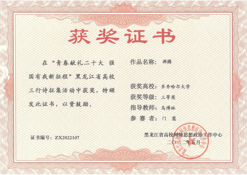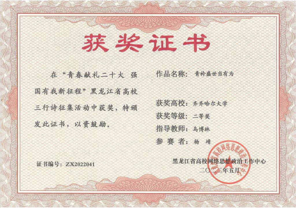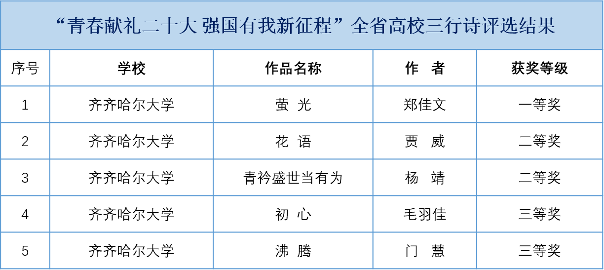 本次全省高校三行詩征集活動以“青春獻禮二十大 強國有我新征程”為主題,吸引了省內(nèi)多所高校大學(xué)生參加,通過積極參與此次活動,在環(huán)湖校園深入宣傳了習(xí)近平總書記帶領(lǐng)全黨全國各族人民在實現(xiàn)中華民族偉大復(fù)興新征程上走過的非凡十年,進一步落實了愛黨愛國愛社會主義教育,征集的大量優(yōu)秀作品全面展現(xiàn)了齊大學(xué)子奮楫揚帆、不負韶華建功新時代的精神風(fēng)貌,為青春喜迎二十大營造了濃厚氛圍。