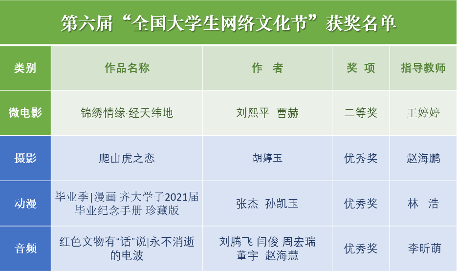 近日,由教育部思想政治工作司、中央網(wǎng)信辦網(wǎng)絡(luò)社會(huì)工作局主辦的第六屆“全國大學(xué)生網(wǎng)絡(luò)文化節(jié)”公布了遴選結(jié)果。我校斬獲全國二等獎(jiǎng)1項(xiàng),全國優(yōu)秀獎(jiǎng)3項(xiàng)。其中,文學(xué)與歷史文化學(xué)院(新聞傳播學(xué)院)王婷婷老師指導(dǎo),劉熙平、曹赫同學(xué)創(chuàng)作的《錦繡情緣·經(jīng)天緯地》榮獲微電影類作品二等獎(jiǎng);齊齊哈爾大學(xué)廣播電臺(tái)胡婷玉同學(xué)的作品《爬山虎之戀》榮獲攝影類作品優(yōu)秀獎(jiǎng);易班工作室張杰、孫凱玉創(chuàng)作的《畢業(yè)季|漫畫 齊大學(xué)子2021屆畢業(yè)紀(jì)念手冊 珍藏版》榮獲動(dòng)漫類作品優(yōu)秀獎(jiǎng);齊齊哈爾大學(xué)廣播電臺(tái)劉騰飛、閆俊、周宏瑞、董宇、趙?;弁瑢W(xué)的作品《紅色文物有“話”說|永不消逝的電波》榮獲音頻類作品優(yōu)秀獎(jiǎng)。