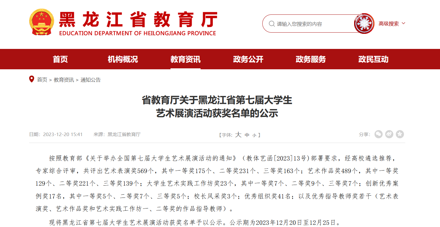 近日,由黑龍江省教育廳主辦的全省第七屆大學生藝術展演活動評選結果揭曉。我校參賽項目成績優(yōu)異,共上報參賽作品68項,獲獎63項,其中一等獎29項,二等獎25項、三等獎9項,獲獎數量、層次均有新突破,是我校文化育人實踐成果的生動體現(xiàn)。