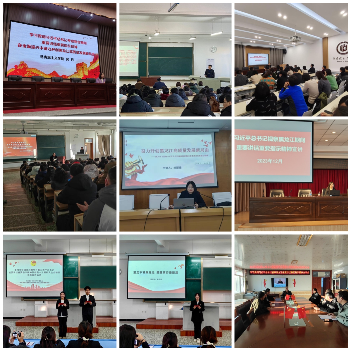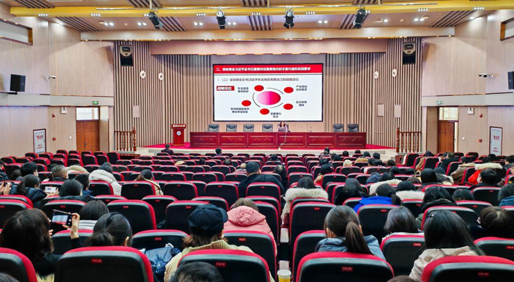立時(shí)代之潮頭,發(fā)思想之先聲。為全面深入學(xué)習(xí)宣傳貫徹習(xí)近平總書記視察我省期間重要講話重要指示精神,教育引導(dǎo)全校師生員工錘煉“扎扎實(shí)實(shí)、踏踏實(shí)實(shí)、求真務(wù)實(shí)”的優(yōu)良作風(fēng),切實(shí)把思想和行動(dòng)統(tǒng)一到習(xí)近平總書記重要講話重要指示精神上來,按照學(xué)校相關(guān)文件部署安排,我校第一時(shí)間遴選黨員干部、專家學(xué)者、思政教師、學(xué)生骨干,組建了習(xí)近平總書記視察我省期間重要講話重要指示精神專家宣講團(tuán)、青年學(xué)生宣講團(tuán)和齊齊哈爾大學(xué)駐永安村宣講小分隊(duì)。2023年12月以來,我校習(xí)近平總書記視察我省期間重要講話重要指示精神宣講團(tuán)成員深入黨員干部、師生和基層群眾,以對(duì)象化、分眾化、互動(dòng)化的方式開展了一系列學(xué)習(xí)宣講活動(dòng),形成了“黨員干部帶頭講、專家學(xué)者深入講、青年學(xué)生自己講、深入基層群眾講”的生動(dòng)局面,掀起了學(xué)習(xí)宣傳貫徹習(xí)近平總書記視察我省期間重要講話重要指示精神的熱潮。