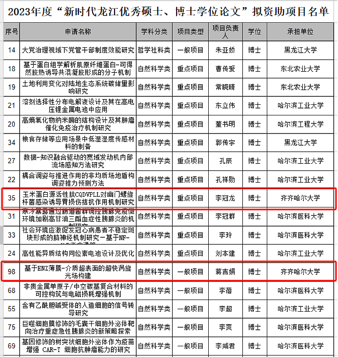 近日,由黑龍江教育廳等六部門組成的“2023年度新時(shí)代龍江優(yōu)秀碩士、博士百篇學(xué)位論文立項(xiàng)”遴選、評(píng)審工作結(jié)束,公布了2023年度立項(xiàng)資助情況,其中,重點(diǎn)項(xiàng)目24項(xiàng),一般項(xiàng)目76項(xiàng)。食品與生物工程學(xué)院新入職教師李冠龍獲批自然科學(xué)類重點(diǎn)項(xiàng)目1項(xiàng),資助金額10萬元,這是我校首次獲批自然科學(xué)類重點(diǎn)項(xiàng)目。通信與電子工程學(xué)院青年教師蔣吉娟獲批自然科學(xué)類一般項(xiàng)目1項(xiàng),資助金額5萬元,這是繼2022年后,我校教師再次獲得該項(xiàng)目資助。