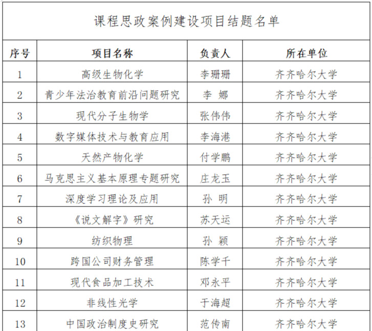 近日,黑龍江省教育廳下發(fā)了《關(guān)于公布2023 年度黑龍江省研究生課程思政建設(shè)項(xiàng)目結(jié)題名單的通知》(黑教研函〔2024〕48號(hào))。我校共有15個(gè)項(xiàng)目通過結(jié)題驗(yàn)收。
