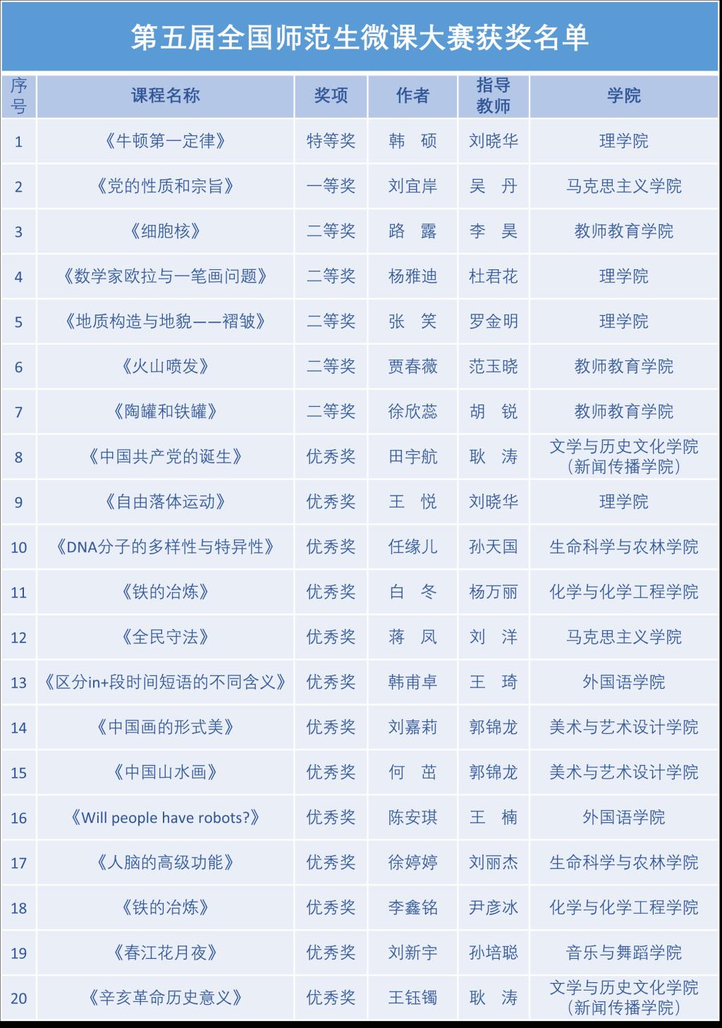 近日,第五屆全國(guó)師范生微課大賽獲獎(jiǎng)名單揭曉,我校學(xué)生在本次大賽中脫穎而出,獲得一個(gè)特等獎(jiǎng),一個(gè)一等獎(jiǎng),五個(gè)二等獎(jiǎng),十三個(gè)優(yōu)秀獎(jiǎng)的優(yōu)異成績(jī)。