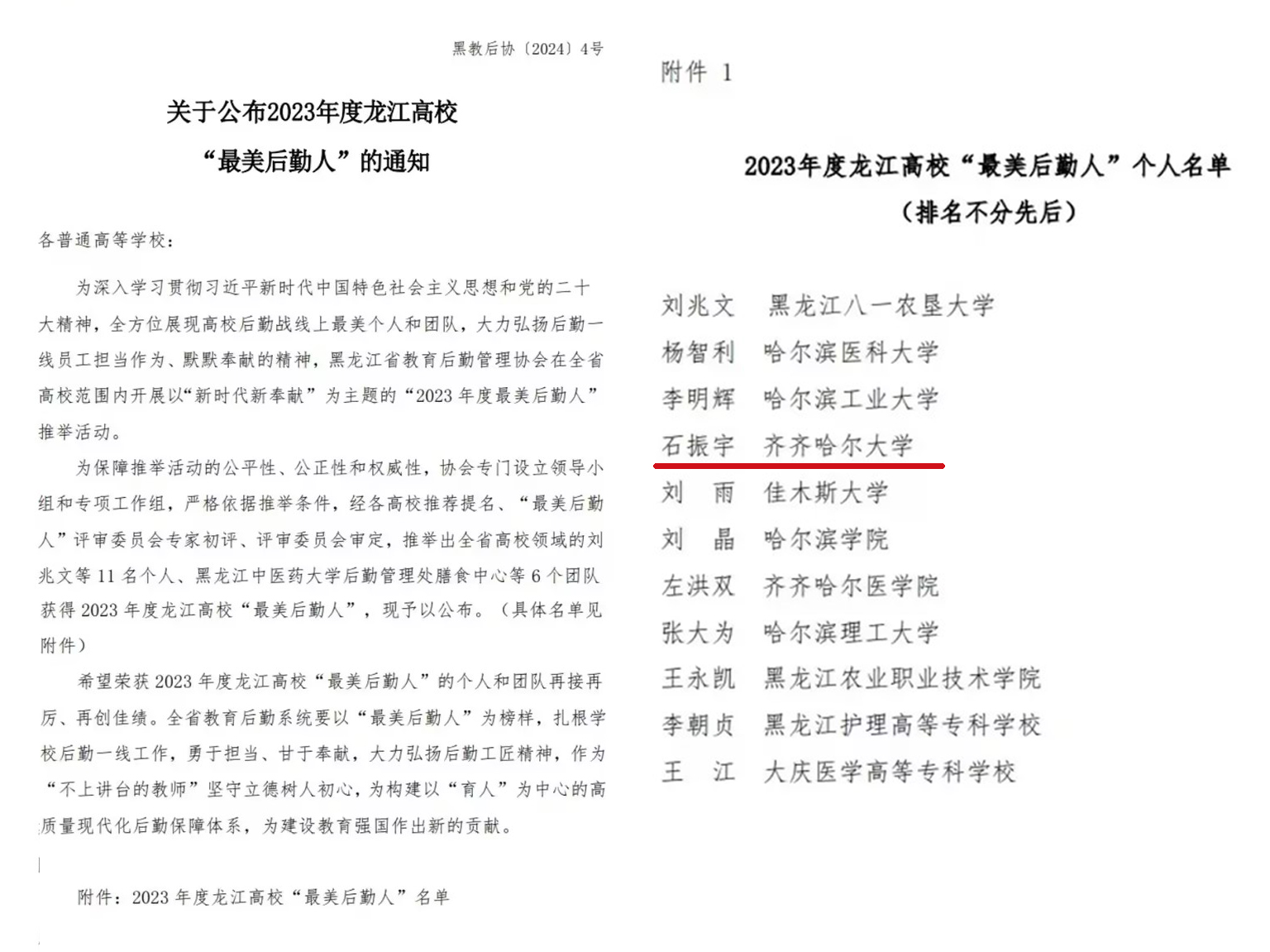 本次評選旨在深入學(xué)習(xí)貫徹習(xí)近平新時代中國特色社會主義思想和黨的二十大精神,全方位展現(xiàn)高校后勤戰(zhàn)線上最美個人和團(tuán)隊(duì),大力弘揚(yáng)后勤一線員工擔(dān)當(dāng)作為、默默奉獻(xiàn)的精神。我校教師石振宇秉持著“緊密聯(lián)系師生,扎根基礎(chǔ)服務(wù)”的工作理念,用實(shí)際行動詮釋著“最美后勤人”的精神內(nèi)涵。2023年9月,石振宇老師榮獲齊齊哈爾大學(xué)2022-2023學(xué)年度“三全育人”先進(jìn)個人稱號。