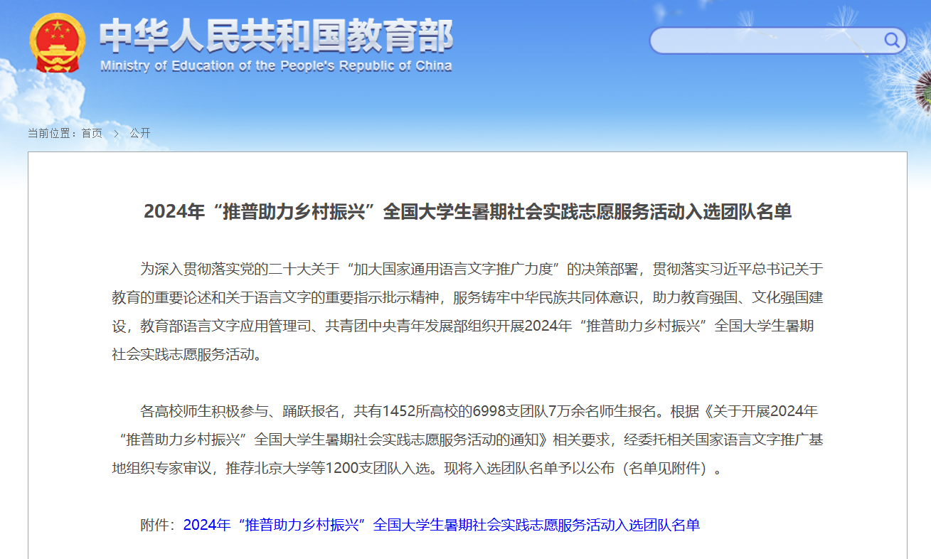 近日,教育部網(wǎng)站公布2024年“推普助力鄉(xiāng)村振興”全國大學(xué)生暑期社會實(shí)踐志愿服務(wù)活動入選團(tuán)隊(duì)名單。經(jīng)委托相關(guān)國家語言文字推廣基地組織專家審議,推薦1200支團(tuán)隊(duì)入選,黑龍江23支團(tuán)隊(duì)上榜,其中我校出彩龍江志愿服務(wù)隊(duì)、研究生志愿服務(wù)隊(duì)兩支團(tuán)隊(duì)從全國1452所高校的6998支團(tuán)隊(duì)中脫穎而出,成功入選,評選結(jié)果被學(xué)習(xí)強(qiáng)國等平臺轉(zhuǎn)載。