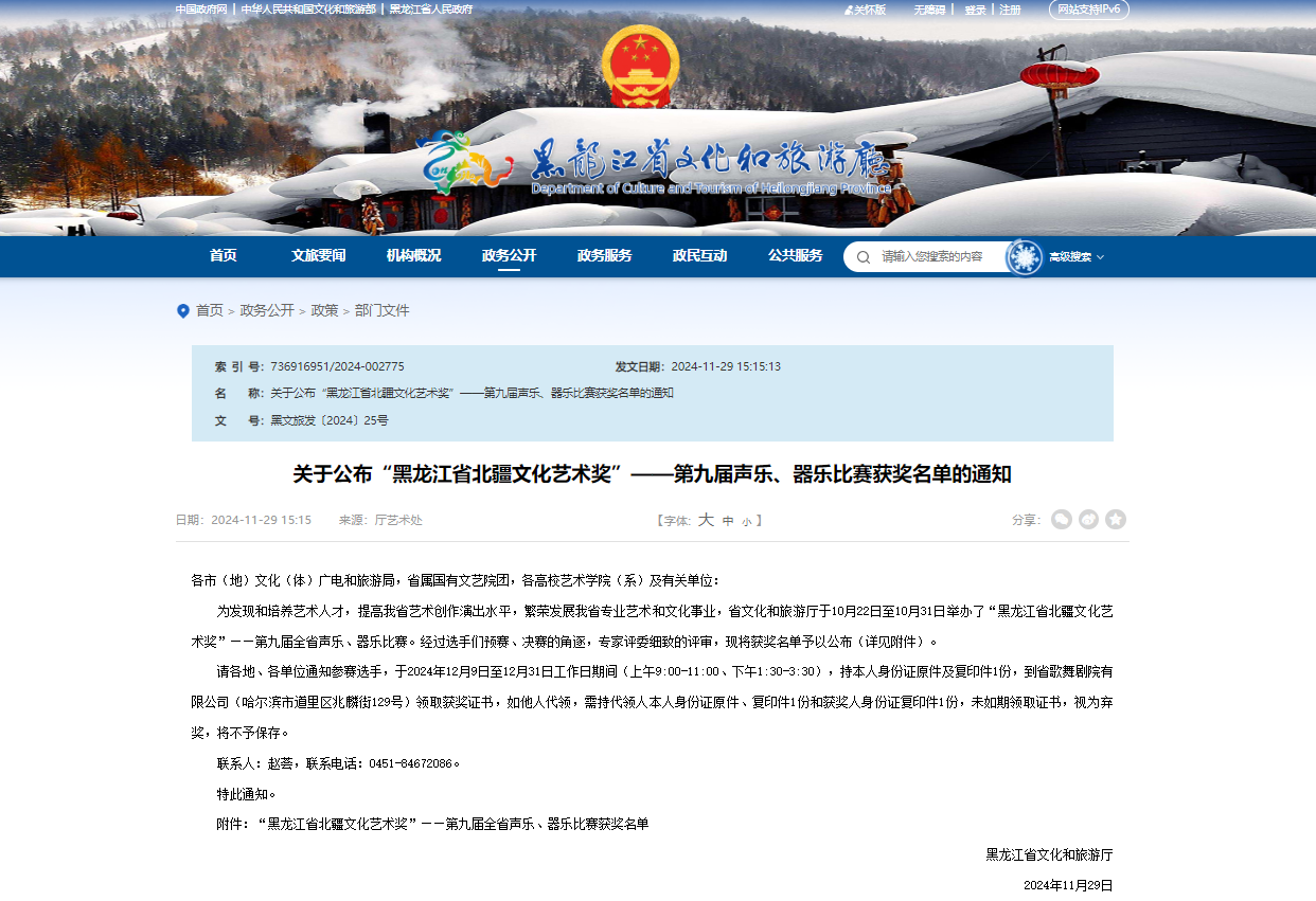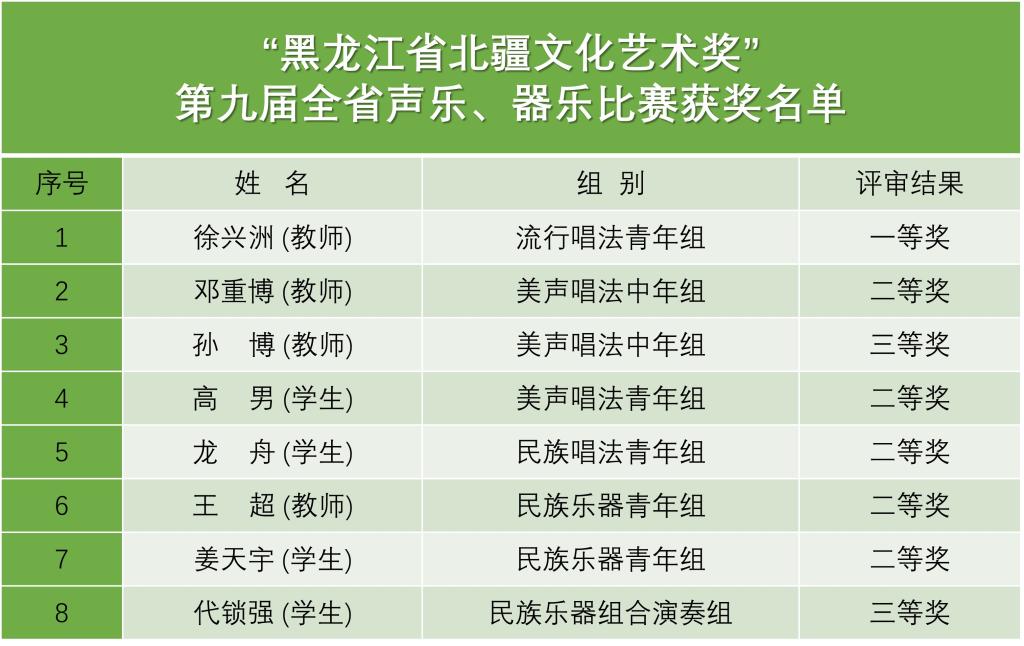 近日,黑龍江省文化和旅游廳下發(fā)了關(guān)于“黑龍江省北疆文化藝術(shù)獎(jiǎng)”——第九屆全省聲樂、器樂比賽獲獎(jiǎng)名單,我校師生在多個(gè)組別中獲獎(jiǎng)。