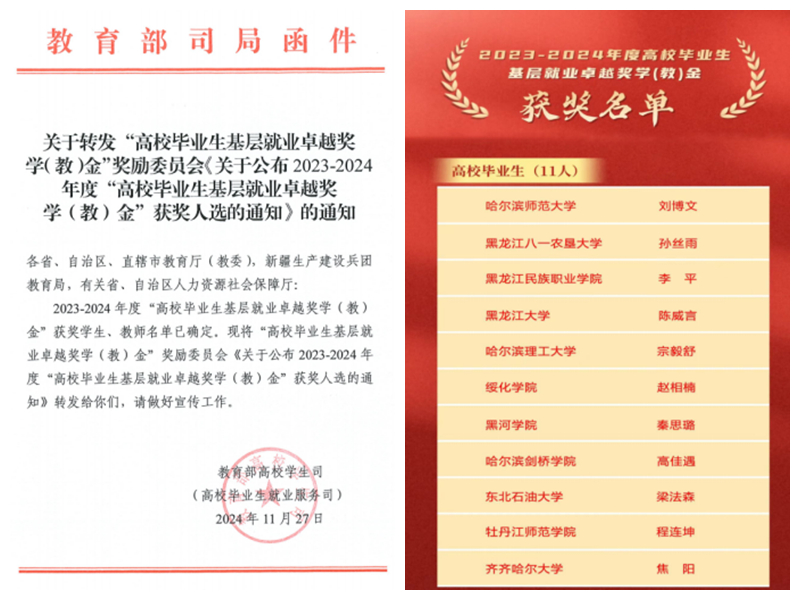 近日,教育部公布2023—2024年度“高校畢業(yè)生基層就業(yè)卓越獎學(xué)(教)金”獲獎人選名單,黑龍江省11名學(xué)生上榜,我校畢業(yè)生焦陽同學(xué)位列其中。