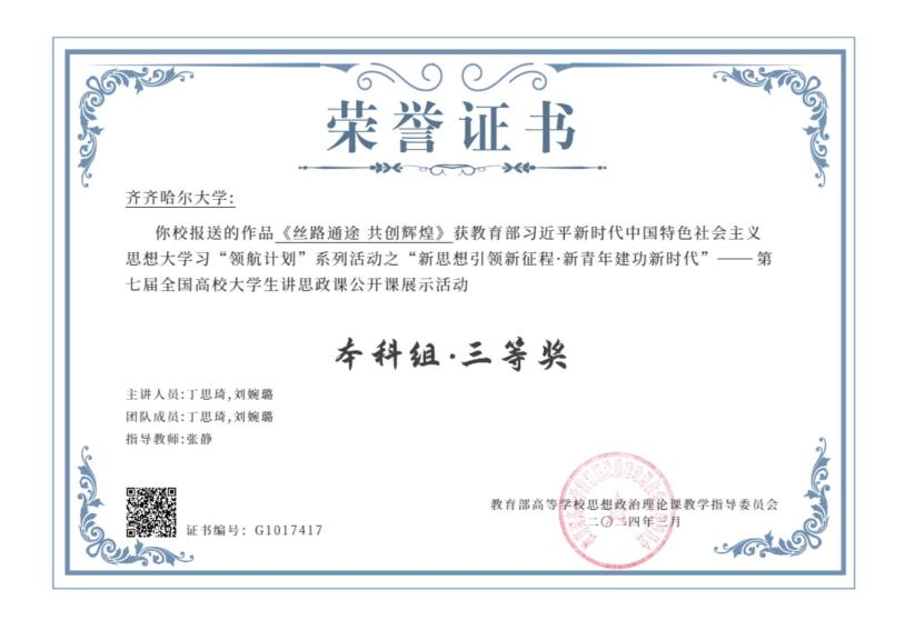 近日,由教育部高校思政課教學(xué)指導(dǎo)委員會(huì)主辦,南開(kāi)大學(xué)馬克思主義學(xué)院承辦的“新思想引領(lǐng)新征程?新青年建功新時(shí)代”——第七屆全國(guó)高校大學(xué)生講思政課公開(kāi)課展示活動(dòng)公布了評(píng)審結(jié)果。我校馬克思主義學(xué)院張靜教授指導(dǎo)的學(xué)生參賽作品《絲路通途 共創(chuàng)輝煌》榮獲本科組三等獎(jiǎng)。