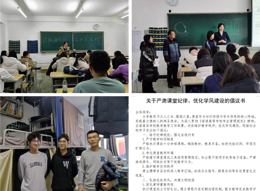 活動中,通過發(fā)送理論學(xué)習(xí)材料,開展上學(xué)期班級學(xué)生學(xué)業(yè)情況深入總結(jié)分析、特殊學(xué)生群體幫扶臺賬建設(shè)、網(wǎng)絡(luò)信息安全提示、組織簽署“安全承諾”、多種形式開展安全教育“三個一”(即:組織一次宿舍安全隱患排查、觀看一部防詐反詐警示教育片、開展一次除顫器AED使用、心肺復(fù)蘇等應(yīng)急救護知識學(xué)習(xí))行動等形式,實現(xiàn)班級全覆蓋。在全校620余個非畢業(yè)班級發(fā)起了“學(xué)風(fēng)建設(shè)倡議”,新建立起“學(xué)業(yè)幫扶小組”310余個,120余班次開展了“青年使命與責(zé)任”主題討論,持續(xù)發(fā)揮科研學(xué)業(yè)導(dǎo)師(班主任)作用,完善互助機制。各二級學(xué)院領(lǐng)導(dǎo)、學(xué)業(yè)導(dǎo)師(班主任)、輔導(dǎo)員共同參與了新學(xué)期主題班會,深入課堂、公寓、食堂等場所圍繞學(xué)生提出的成長困惑以及關(guān)心關(guān)注的就業(yè)、升學(xué)等問題提供有針對性的指導(dǎo)幫助,激勵學(xué)生厚植家園情懷,涵養(yǎng)進(jìn)取品格。