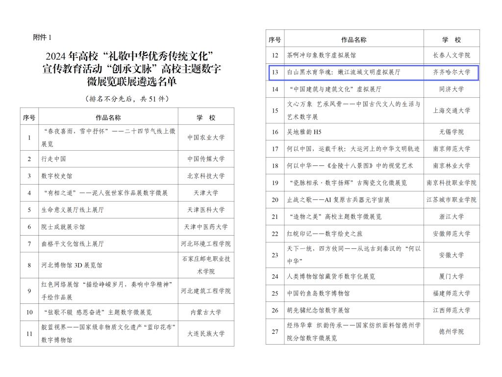 近日,教育部公布《2024年高?!岸Y敬中華優(yōu)秀傳統(tǒng)文化”宣傳教育活動(dòng)結(jié)果的通知》,由我校黨委宣傳部李昕萌老師與文學(xué)歷史文化學(xué)院(新聞傳播學(xué)院)耿濤老師聯(lián)合制作的《白山黑水育華魂:嫩江流域文明虛擬展廳》成功入選“創(chuàng)承文脈”高校主題數(shù)字微展覽聯(lián)展遴選名單,是全省唯一入選的高校作品。該作品是學(xué)校依托“黑龍江省鑄牢中華民族共同體意識(shí)研究基地”在推動(dòng)中華優(yōu)秀傳統(tǒng)文化創(chuàng)造性轉(zhuǎn)化和創(chuàng)新性發(fā)展領(lǐng)域取得的又一亮點(diǎn)成果。
