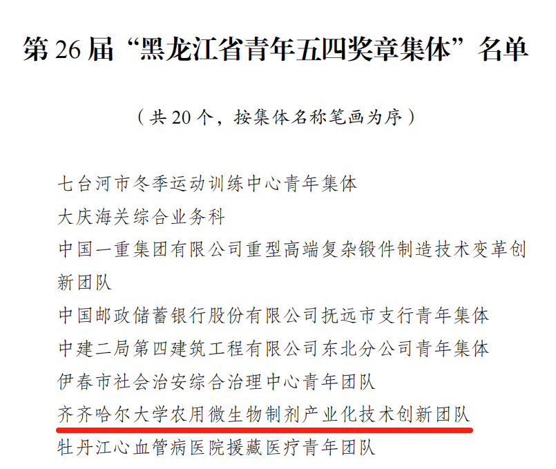 近日,團(tuán)省委、省青聯(lián)聯(lián)合發(fā)布了《關(guān)于頒授第26屆黑龍江省青年五四獎(jiǎng)?wù)碌臎Q定》,我校農(nóng)用微生物制劑產(chǎn)業(yè)化技術(shù)創(chuàng)新團(tuán)隊(duì)榮獲第26屆“黑龍江省青年五四獎(jiǎng)?wù)录w”榮譽(yù)稱號(hào)。