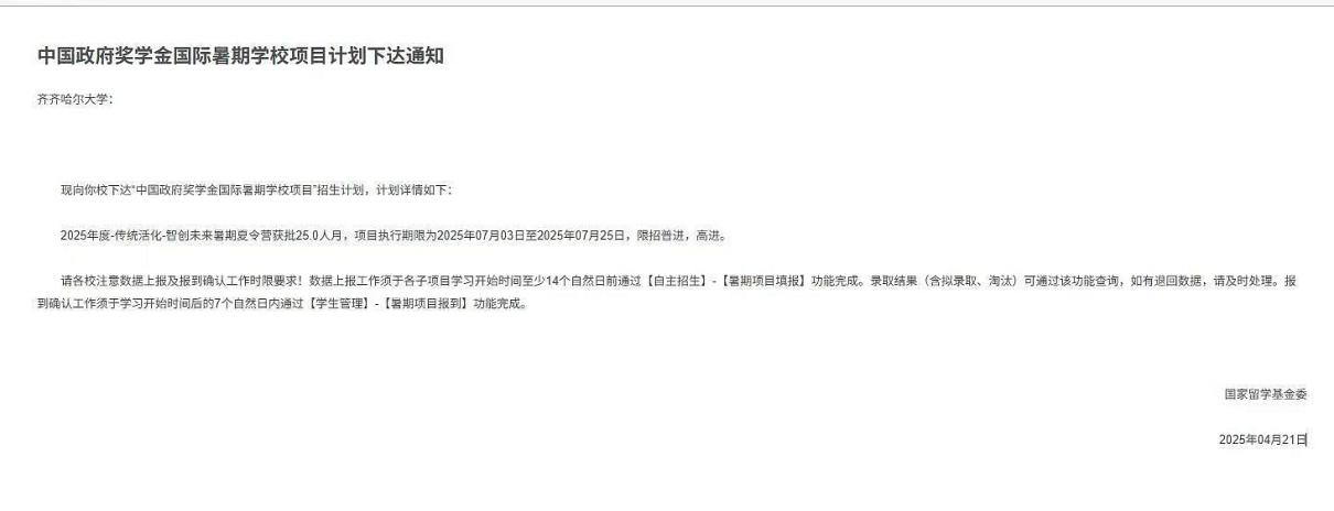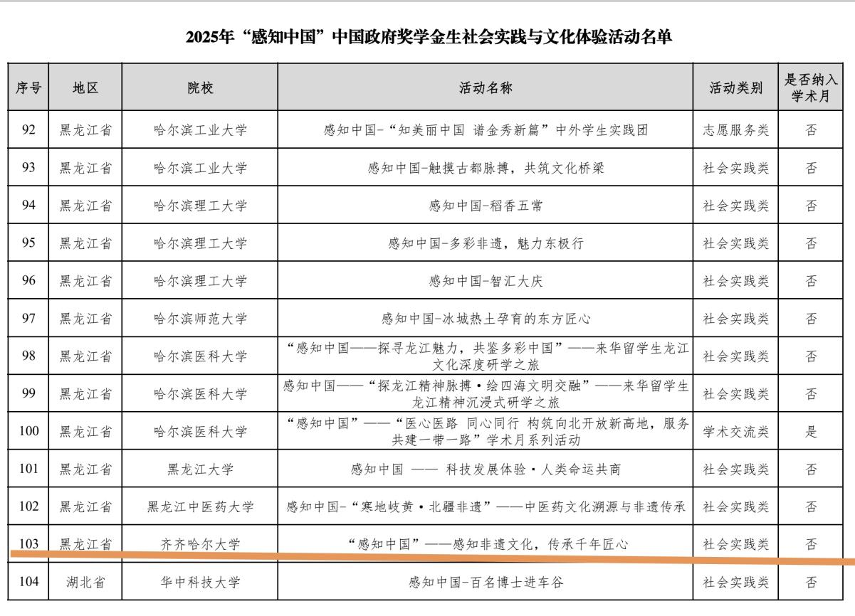 近日,國(guó)家留學(xué)基金管理委員會(huì)下發(fā)了《中國(guó)政府獎(jiǎng)學(xué)金國(guó)際暑期學(xué)校項(xiàng)目計(jì)劃下達(dá)通知》及《2025年“感知中國(guó)”活動(dòng)方案批復(fù)》,我校申報(bào)的《齊齊哈爾大學(xué)-傳統(tǒng)活化·智創(chuàng)未來(lái)暑期夏令營(yíng)》《“感知中國(guó)”——感知非遺文化,傳承千年匠心》2個(gè)項(xiàng)目通過(guò)評(píng)審。