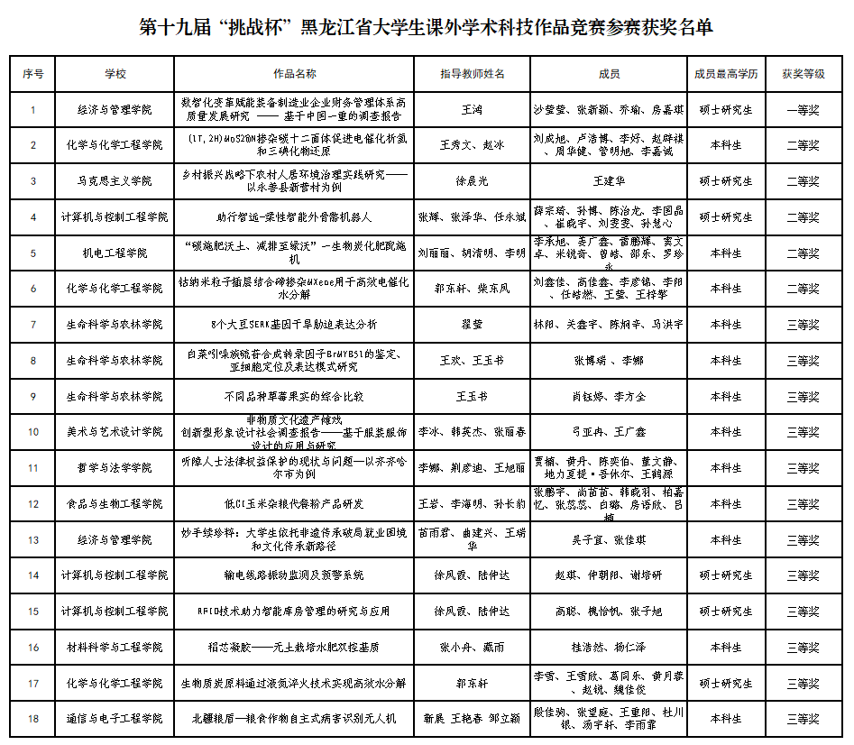 近日,由團(tuán)省委、省科學(xué)技術(shù)協(xié)會、省教育廳、省科技廳、省社會科學(xué)院、省學(xué)生聯(lián)合會主辦,東北石油大學(xué)承辦的第十九屆工銀融e行 “挑戰(zhàn)杯”黑龍江省大學(xué)生課外學(xué)術(shù)科技作品競賽評審結(jié)果公示發(fā)布。我校代表隊(duì)斬獲一等獎1項(xiàng)、二等獎5項(xiàng)、三等獎12項(xiàng)。