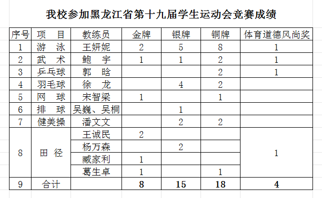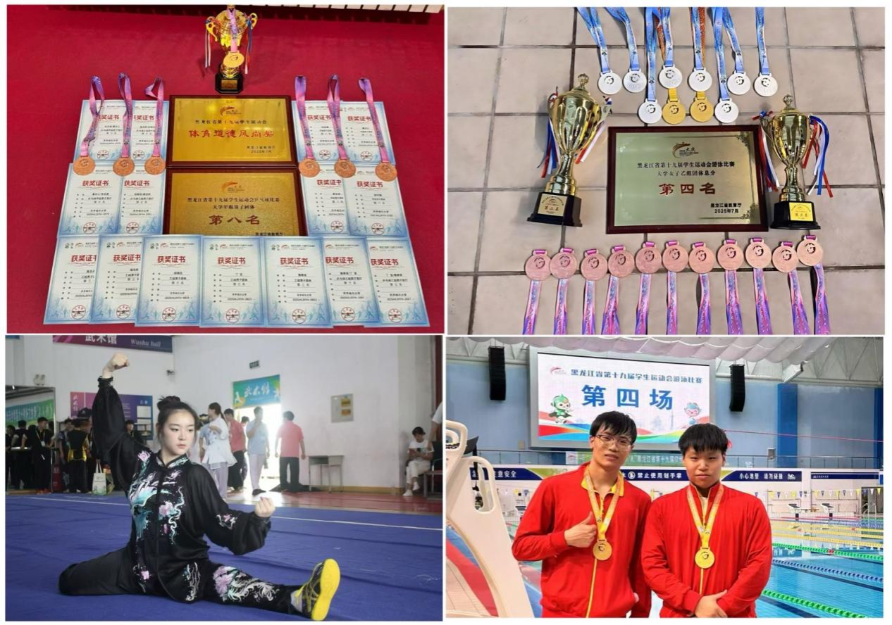 7月15日至25日,黑龍江省第十九屆學(xué)生運(yùn)動(dòng)會(huì)在大慶市舉行。本屆運(yùn)動(dòng)會(huì)設(shè)高校組、地市組兩大板塊,我校選派100名師生組成代表團(tuán),在游泳、武術(shù)、乒乓球、羽毛球、網(wǎng)球、排球、健美操、田徑八個(gè)項(xiàng)目中展開(kāi)激烈角逐。經(jīng)過(guò)十天激烈比拼,我校運(yùn)動(dòng)員憑借出色發(fā)揮和頑強(qiáng)拼搏,最終獲得8金、15銀、18銅,總計(jì)41枚獎(jiǎng)牌,大學(xué)乙組團(tuán)體總分第三名的優(yōu)異戰(zhàn)績(jī)。