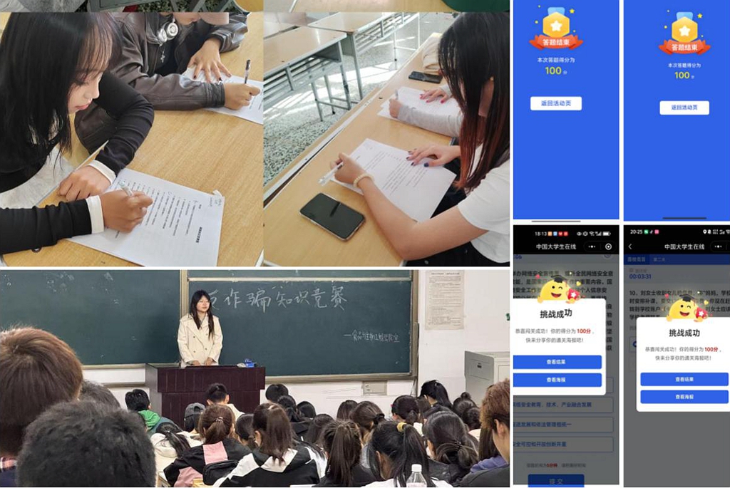 宣傳周期間,學(xué)校組織師生通過中國大學(xué)生在線參與網(wǎng)絡(luò)安全知識答題活動(dòng),普及防詐騙、防非法校園貸等知識。計(jì)算機(jī)與控制工程學(xué)院、食品與生物工程學(xué)院等單位還組織開展網(wǎng)絡(luò)安全知識競賽,涵蓋法規(guī)、案例應(yīng)急處置等內(nèi)容,以賽促學(xué);文學(xué)與歷史文化學(xué)院(新聞傳播學(xué)院)、外國語學(xué)院等單位開展創(chuàng)意作品征集,收到微視頻、宣傳海報(bào)、手抄報(bào)等作品,以視覺化形式闡釋網(wǎng)絡(luò)安全重要性。