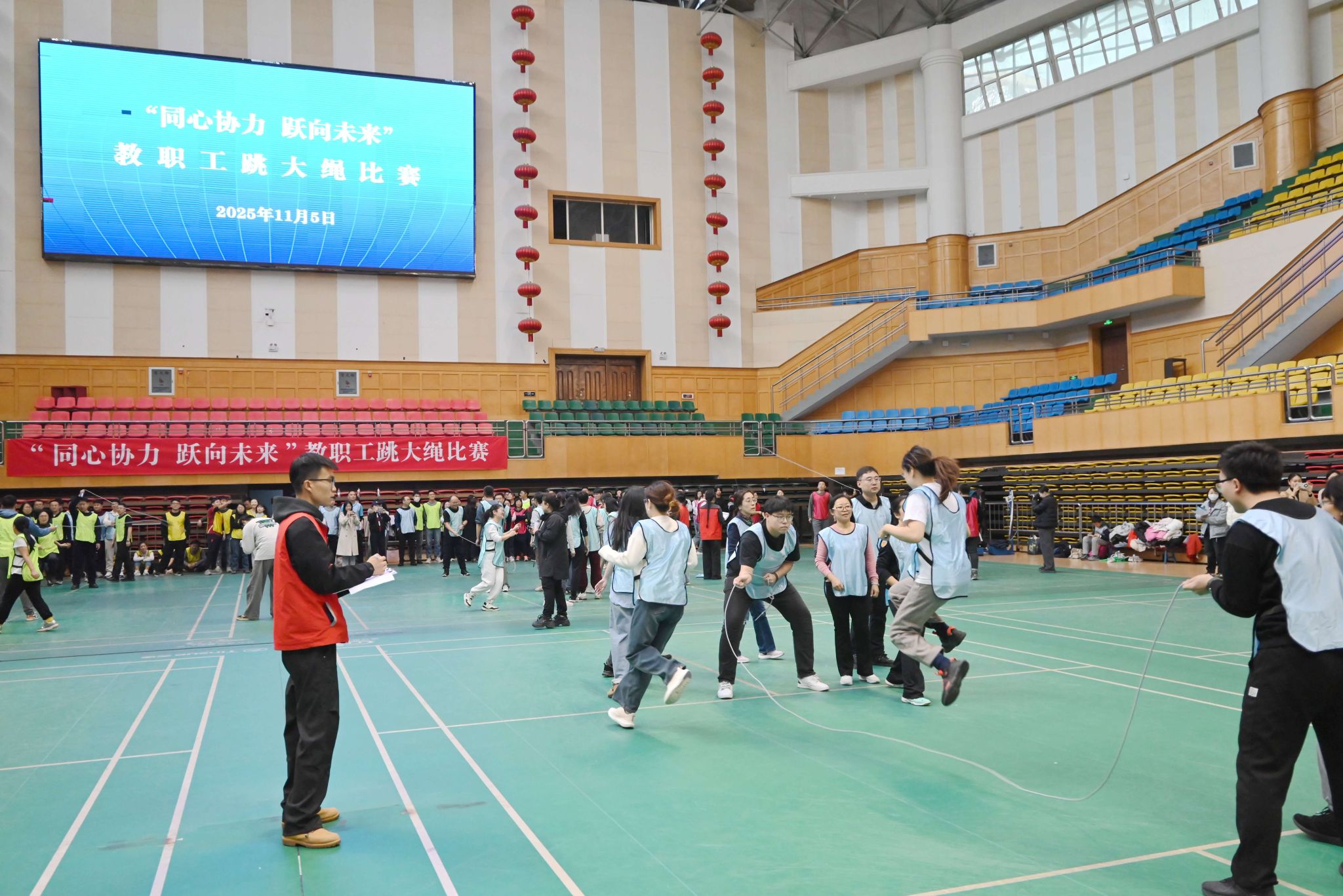 11月5日下午,西區(qū)體育館內(nèi)掌聲雷動(dòng)、歡聲陣陣,由校工會(huì)主辦的“同心協(xié)力 躍向未來”2025年教職工跳大繩比賽在這里火熱舉行。本次比賽共吸引了全校19個(gè)基層工會(huì)的21支代表隊(duì)參賽,各參賽隊(duì)伍在賽場(chǎng)上展現(xiàn)了卓越的團(tuán)隊(duì)協(xié)作精神和昂揚(yáng)向上的風(fēng)貌。