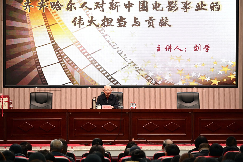 活動(dòng)伊始,國(guó)家電影學(xué)者、電影追夢(mèng)人劉學(xué)老先生以《齊齊哈爾人對(duì)新中國(guó)電影事業(yè)的偉大擔(dān)當(dāng)與貢獻(xiàn)》為題展開專題講座。劉老結(jié)合詳實(shí)的史料與生動(dòng)的影像片段,系統(tǒng)梳理了齊齊哈爾籍電影人從新中國(guó)電影初創(chuàng)期到改革開放后的奮斗軌跡,深入剖析了他們?cè)诰巹?、?dǎo)演、表演、技術(shù)革新等領(lǐng)域的突破性貢獻(xiàn)。從早期電影教育的拓荒者到紅色經(jīng)典的創(chuàng)作者,從東北電影文化的傳播者到新時(shí)代電影產(chǎn)業(yè)的推動(dòng)者,劉老的講述勾勒出一幅“以影報(bào)國(guó)、以文化人”的奮斗圖景,讓在場(chǎng)觀眾深刻感受到齊齊哈爾電影人“與時(shí)代同步、為人民放歌”的家國(guó)情懷。