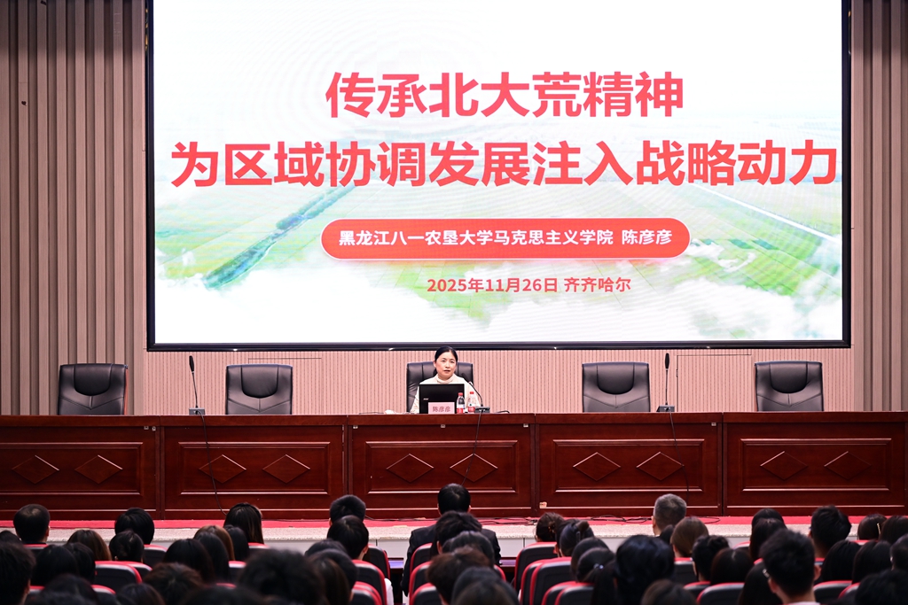 宣講報告會由全國高?!爸袊伯a(chǎn)黨人精神譜系”宣講團成員、黑龍江省北大荒精神學(xué)術(shù)交流基地主任、黑龍江八一農(nóng)墾大學(xué)馬克思主義學(xué)院院長、北大荒精神與文化研究所所長陳彥彥主講。她以《傳承北大荒精神,為區(qū)域協(xié)調(diào)發(fā)展注入戰(zhàn)略動力》為題,通過大量的歷史照片、詳實的數(shù)據(jù)資料和生動的語言,深情講述了北大荒開發(fā)建設(shè)的輝煌歷程與艱苦卓絕的奮斗史詩,深度解讀了北大荒人勇于開拓、執(zhí)著堅守、赤誠奉獻的情懷與擔(dān)當(dāng),系統(tǒng)梳理了北大荒精神從形成、發(fā)展到不斷豐富的演進脈絡(luò),深刻詮釋了以“自力更生、艱苦創(chuàng)業(yè)、勇于開拓、甘于奉獻”為主要內(nèi)涵的北大荒精神。宣講報告內(nèi)容豐富、視野宏闊、論述精辟、感染力強,既有理論闡釋、又有感人事跡,既有思想深度、又有教育溫度,對全校廣大黨員、干部、師生更好地傳承紅色基因、賡續(xù)紅色血脈具有很強的示范性、指導(dǎo)性和啟發(fā)性。