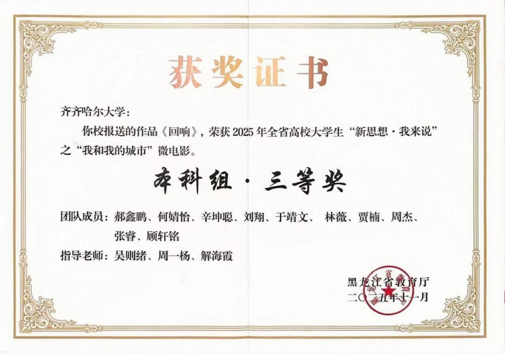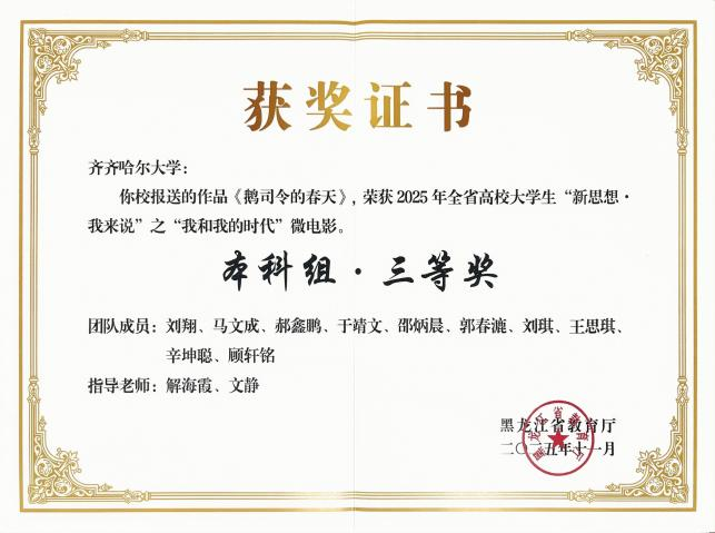近日,由黑龍江省教育廳主辦的2025年全省高校大學(xué)生“新思想·我來說”主題展示活動評選結(jié)果揭曉。我校選送的由解海霞、文靜老師指導(dǎo)的作品《鵝司令的春天》榮獲“我和我的時代”微電影本科組三等獎,由吳則緒、周一楊、解海霞老師指導(dǎo)的作品《回響》榮獲“我和我的城市”微電影本科組三等獎,充分展現(xiàn)了我校思政育人成果與青年學(xué)子的青春風(fēng)采。