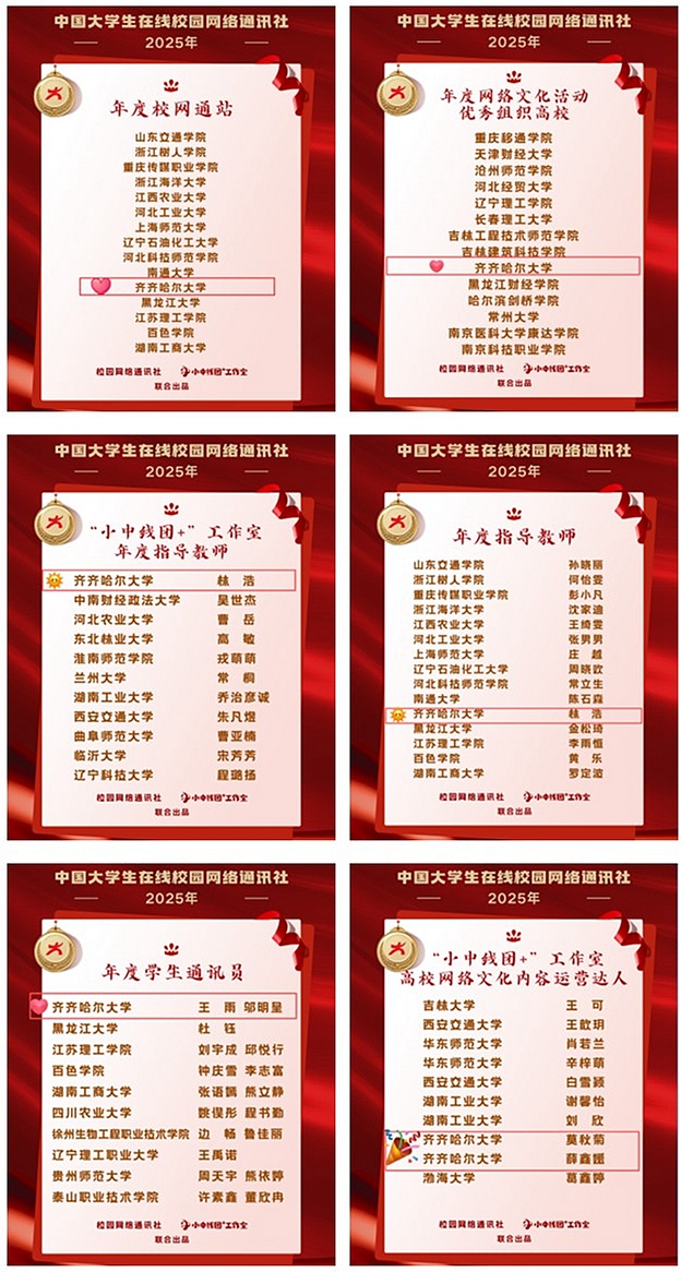 近日,中國大學(xué)生在線校園網(wǎng)絡(luò)通訊社2025年度評選結(jié)果揭曉,齊齊哈爾大學(xué)憑借在校園網(wǎng)絡(luò)通訊工作及網(wǎng)絡(luò)文化建設(shè)中的突出表現(xiàn),一舉斬獲“年度校網(wǎng)通站”“年度網(wǎng)絡(luò)文化活動優(yōu)秀組織高?!眱身椫匾w榮譽,學(xué)生工作部(學(xué)生處、武裝部)林浩獲評“年度指導(dǎo)教師”與“小中線團+”工作室年度指導(dǎo)教師兩項個人榮譽;學(xué)生骨干王雨、鄔明呈獲評“年度學(xué)生通訊員”,學(xué)生骨干莫秋菊、薛鑫媛獲評“小中線團+”工作室高校網(wǎng)絡(luò)文化內(nèi)容運營達人。學(xué)校獲獎質(zhì)量和數(shù)量均位居公布的全國高校前列。