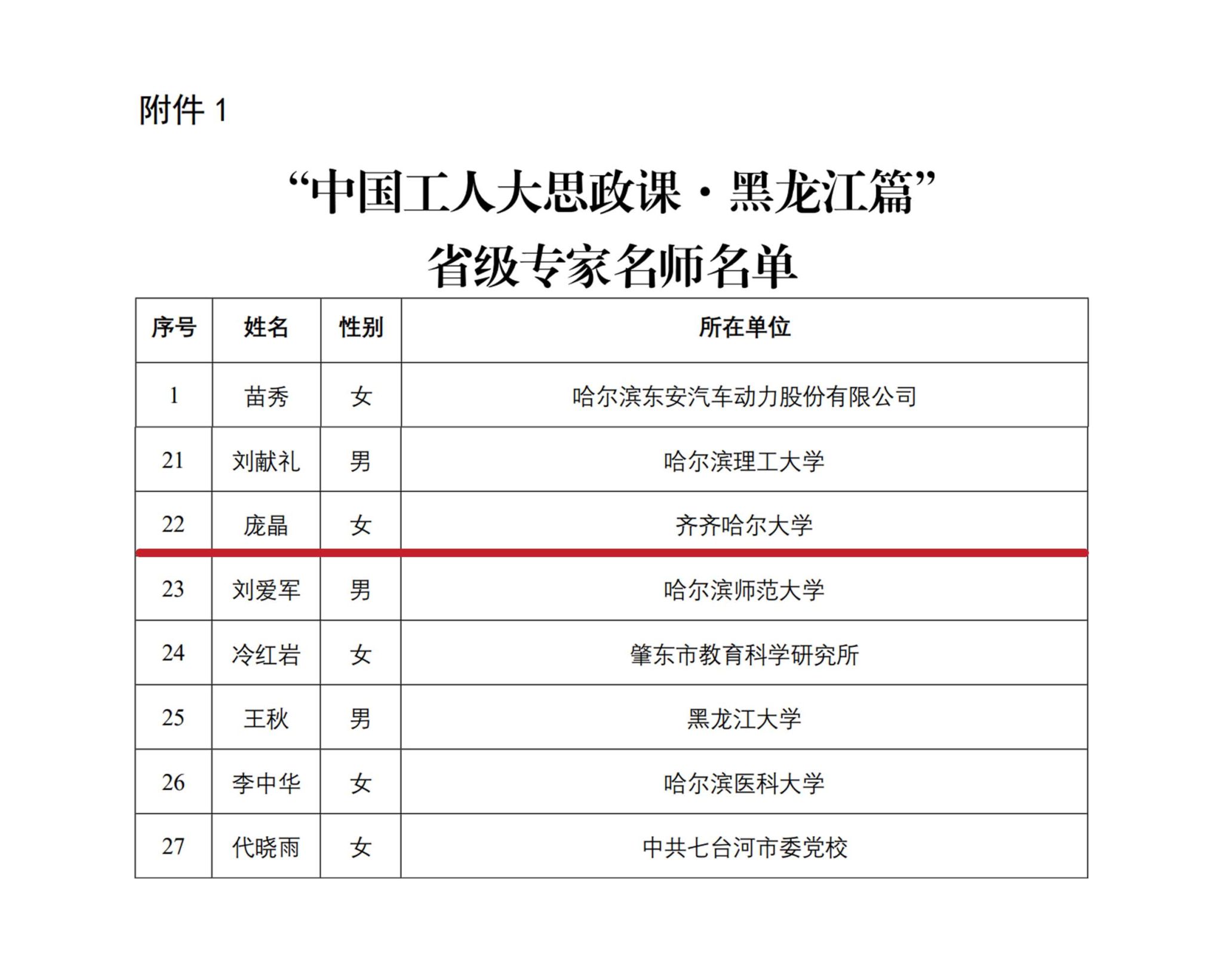 日前,黑龍江省總工會辦公室印發(fā)通報,公布2025年“中國工人大思政課·黑龍江篇”省級專家名師評選結(jié)果。我校馬克思主義學(xué)院馬克思主義中國化教研部主任龐晶教授成功入選。