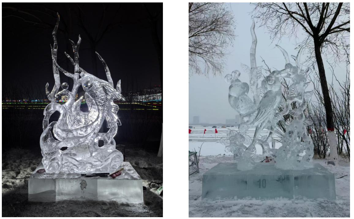 2025年12月27日,第二十三屆黑龍江省大學(xué)生冰雕比賽在哈爾濱兆麟公園落下帷幕。全省50支高校代表隊近百名師生參賽,我校學(xué)生作品《照日生紅暖見魚》獲得制作類二等獎,《鳳凰游》獲得設(shè)計類二等獎。