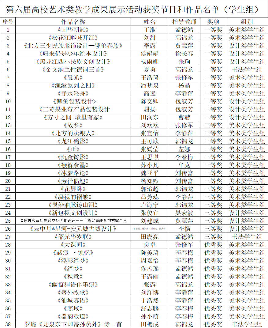 近日,黑龍江省文化和旅游廳公布了黑龍江省第六屆高校藝術(shù)類教學(xué)成果展示活動(dòng)的獲獎(jiǎng)節(jié)目與作品名單。我校師生在此次活動(dòng)中表現(xiàn)優(yōu)異,再創(chuàng)佳績(jī):教師組獲獎(jiǎng)5項(xiàng),學(xué)生組獲獎(jiǎng)38項(xiàng)。據(jù)悉,本次活動(dòng)全省共有42所高校參與,報(bào)送師生作品2828件,最終1389件作品獲獎(jiǎng)。