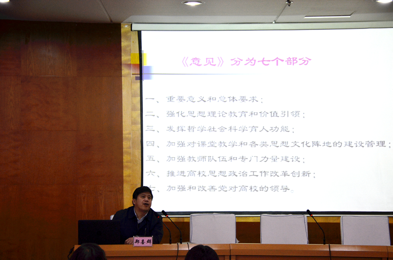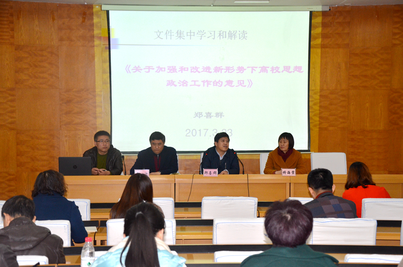 鄭喜群就中共中央、國務(wù)院印發(fā)的《關(guān)于加強(qiáng)和改進(jìn)新形勢下高校思想政治工作的意見》中與學(xué)生工作緊密相關(guān)的內(nèi)容向與會同志進(jìn)行了傳達(dá)和解讀。他表示,習(xí)總書記在點評“95后”大學(xué)生時指出:“他們朝氣蓬勃、好學(xué)上進(jìn)、視野寬廣、開放自信,是可愛、可信、可為的一代。”這就要求我們做好思想政治工作,必須要充分了解我們的學(xué)生是什么樣的、他們在想什么、關(guān)注什么、希望什么。他強(qiáng)調(diào),做好高校思想政治工作,必須要堅持“立德樹人”根本原則,開展工作要因事而化、因時而進(jìn)、因勢而新;必須要遵循思想政治工作規(guī)律,遵循教書育人規(guī)律,遵循學(xué)生成長規(guī)律;必須要樹立“圍繞學(xué)生、關(guān)照學(xué)生、服務(wù)學(xué)生”的新理念。