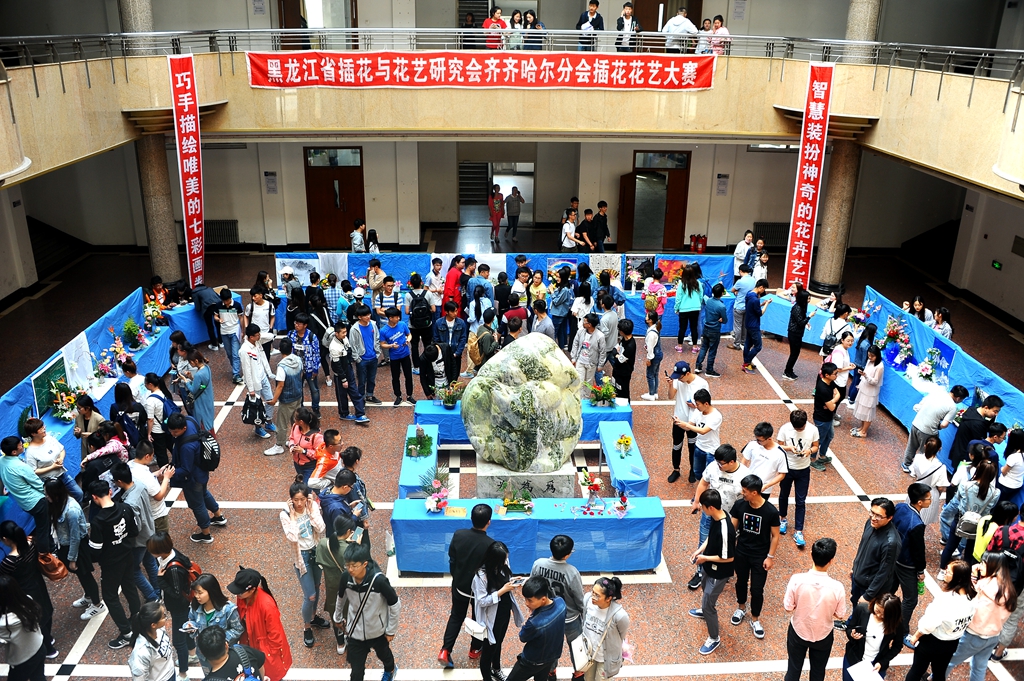 省插花花藝研究會齊齊哈爾分會插花花藝大賽已成功舉辦六屆,已經成為我校校園文化藝術品牌活動。大賽的開展培養(yǎng)了學生的創(chuàng)新精神,提高了學生的實踐能力,提升了學生的審美修養(yǎng),陶冶了情操,交流了技藝,營造了濃郁的校園文化藝術氛圍。