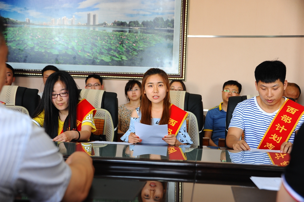 歡送會上,志愿者代表張競尹用樸實的語言表達(dá)了志愿服務(wù)西部的決心和對母校深深的眷戀。她認(rèn)為參加西部計劃是一項光榮的使命,是一次將奉獻(xiàn)國家與實現(xiàn)自我價值完美結(jié)合的寶貴經(jīng)歷,志愿者服務(wù)西部也是一次挑戰(zhàn),一次考驗,一次磨礪。馬上要開始新的征程了,我們會銘記母校的培養(yǎng)和囑托,踏踏實實地在平凡的崗位上工作,以”踏實敬業(yè)”的齊大畢業(yè)生精神譜寫不平凡的青春之歌。大學(xué)生志愿者分別發(fā)言,紛紛表達(dá)了奉獻(xiàn)西部,為母校爭光的決心。
