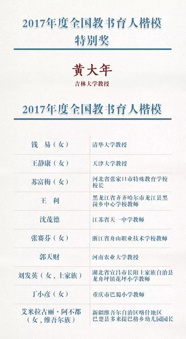 9月1日上午,教育部召開第三場教育金秋系列發(fā)布會(huì)。會(huì)上,教育部教師司司長王定華公布了2017年全國教書育人楷模名單。經(jīng)過各省推薦、媒體展示、公眾投票、組委會(huì)推選,最終選出10+1名2017年全國教書育人楷模。