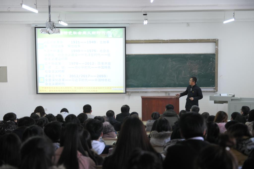 在東區(qū)25教階梯302教室,校黨的十九大精神宣講團成員、馬克思主義學院中國近現(xiàn)代史綱要教研部主任、碩士生導師張春波副教授以《新思想引領新時代新使命開啟新征程》為題,從新時代、新矛盾——進行偉大斗爭,新理論、新思想——建設偉大工程,新任務、新舉措——推進偉大事業(yè),新使命、新征程——實現(xiàn)偉大夢想等四個方面闡釋了黨的十九大的“新”。他指出,只有進行新的偉大斗爭才能開創(chuàng)新時代,解決新矛盾。只有以馬克思主義中國化最新成果——習近平新時代中國特色社會主義思想為行動指南,才能建設新的偉大工程。他分析了推進中國特色社會主義偉大事業(yè)的新任務和新舉措,提出在實現(xiàn)中華民族偉大復興中國夢的新征程中廣大師生的使命擔當。經(jīng)濟與管理學院全體教職工、學生黨員及入黨積極分子參加了宣講活動。