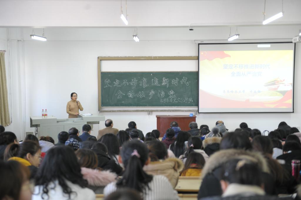 在東區(qū)25教階梯301教室,校黨的十九大精神宣講團成員、馬克思主義學院副院長、碩士生導師于春梅教授以《堅定不移推進新時代全面從嚴治黨》為題,從充分認識五年來全面從嚴治黨的重大成就、明確新時代全面從嚴治黨的總體要求、全面把握黨的十九大對新時代全面從嚴治黨的新部署等方面,對黨的十九大精神進行了系統(tǒng)、全面、深入的講解。于春梅指出,中國特色社會主義進入新時代,面臨新環(huán)境新挑戰(zhàn)新問題,打鐵必須自身硬,因此必須堅定不移推進新時代全面從嚴治黨這一偉大工程,必須進一步把我們黨建設好、建設強,使我們黨成為堅強有力的領導力量,從而決勝全面建成小康社會、奪取新時代中國特色社會主義偉大勝利。文學與歷史文化學院全體教職工、學生黨員及入黨積極分子參加了宣講活動。