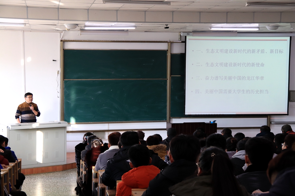 在西區(qū)1教階梯202教室,校黨的十九大精神宣講團成員、馬克思主義學院馬克思主義基本原理教研部主任、博士、碩士生導師王圣禎教授以《認真學習十九大生態(tài)文明新思想奮力譜寫美麗中國的龍江華章》為題,從生態(tài)文明建設新時代的新矛盾與新目標、生態(tài)文明建設新時代的新使命、奮力譜寫美麗中國的龍江華章、美麗中國與大學生的歷史擔當?shù)确矫孢M行了解讀。他指出,實現(xiàn)美麗中國偉大夢想,一要戰(zhàn)勝生態(tài)挑戰(zhàn)的偉大斗爭,二要建設生態(tài)馬克思主義政黨的偉大工程,三要推進中國特色社會主義生態(tài)文明建設偉大事業(yè)。緊密結合省情,在立足得天獨厚的龍江自然資源優(yōu)勢中搶占綠色發(fā)展制高點,促進綠色發(fā)展。建設美麗中國更需要大學生的歷史擔當。體育學院全體教職工、學生黨員及入黨積極分子參加了宣講活動。