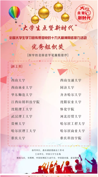 近日,由教育部思想政治工作司指導(dǎo),中國(guó)大學(xué)生在線主辦的“大學(xué)生點(diǎn)贊新時(shí)代”全國(guó)大學(xué)生學(xué)習(xí)宣傳貫徹黨的十九大精神網(wǎng)絡(luò)接力活動(dòng)已經(jīng)圓滿收官,我校在此次活動(dòng)中獲得優(yōu)秀組織獎(jiǎng)。