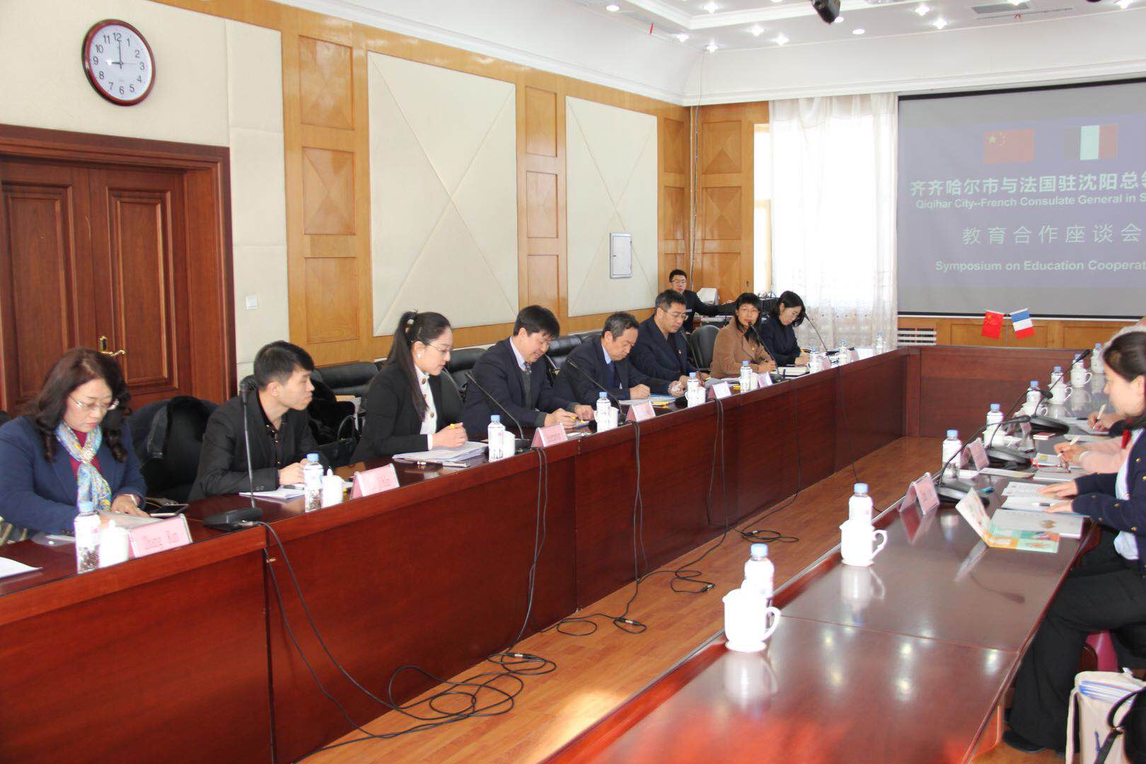 3月8日,法國駐沈陽總領(lǐng)事館科技教育領(lǐng)事都琳(中文名)女士、高等教育署署長丁波(中文名)先生、哈爾濱辦事處負(fù)責(zé)人張婧女士一行訪問我市,市外事僑務(wù)辦公室召開交流合作座談會(huì),我校副校長呂厚均出席座談會(huì)并就與法國高校及重點(diǎn)中學(xué)間的校際交流進(jìn)行了探討,座談會(huì)上播放了我校制作的文化育人專題片,引起了法國來訪人員對我校的濃厚興趣。