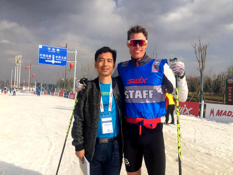 (李金輝老師與挪威運(yùn)動(dòng)員、平昌冬奧會(huì)三金得主克萊博合影)