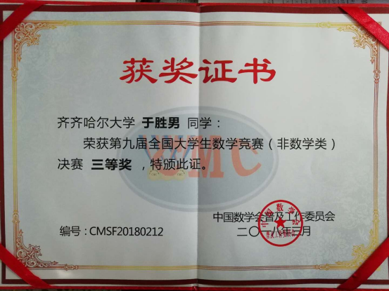 我校于勝男同學(xué)在第九屆全國(guó)大學(xué)生數(shù)學(xué)競(jìng)賽中獲得優(yōu)異成績(jī)