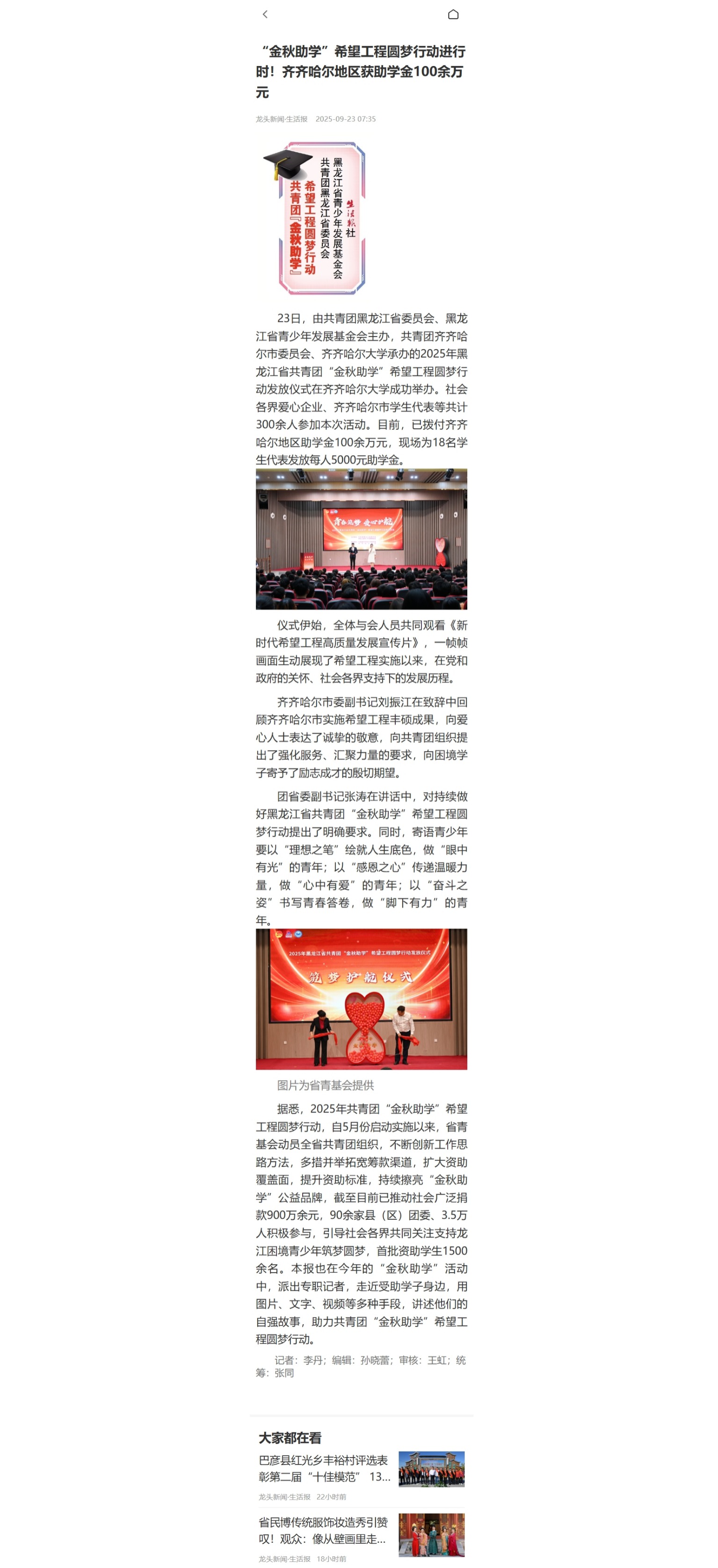 上一條:【黑龍江日?qǐng)?bào)】“金秋助學(xué)”希望工程圓夢(mèng)行動(dòng)舉行助學(xué)金發(fā)放儀式